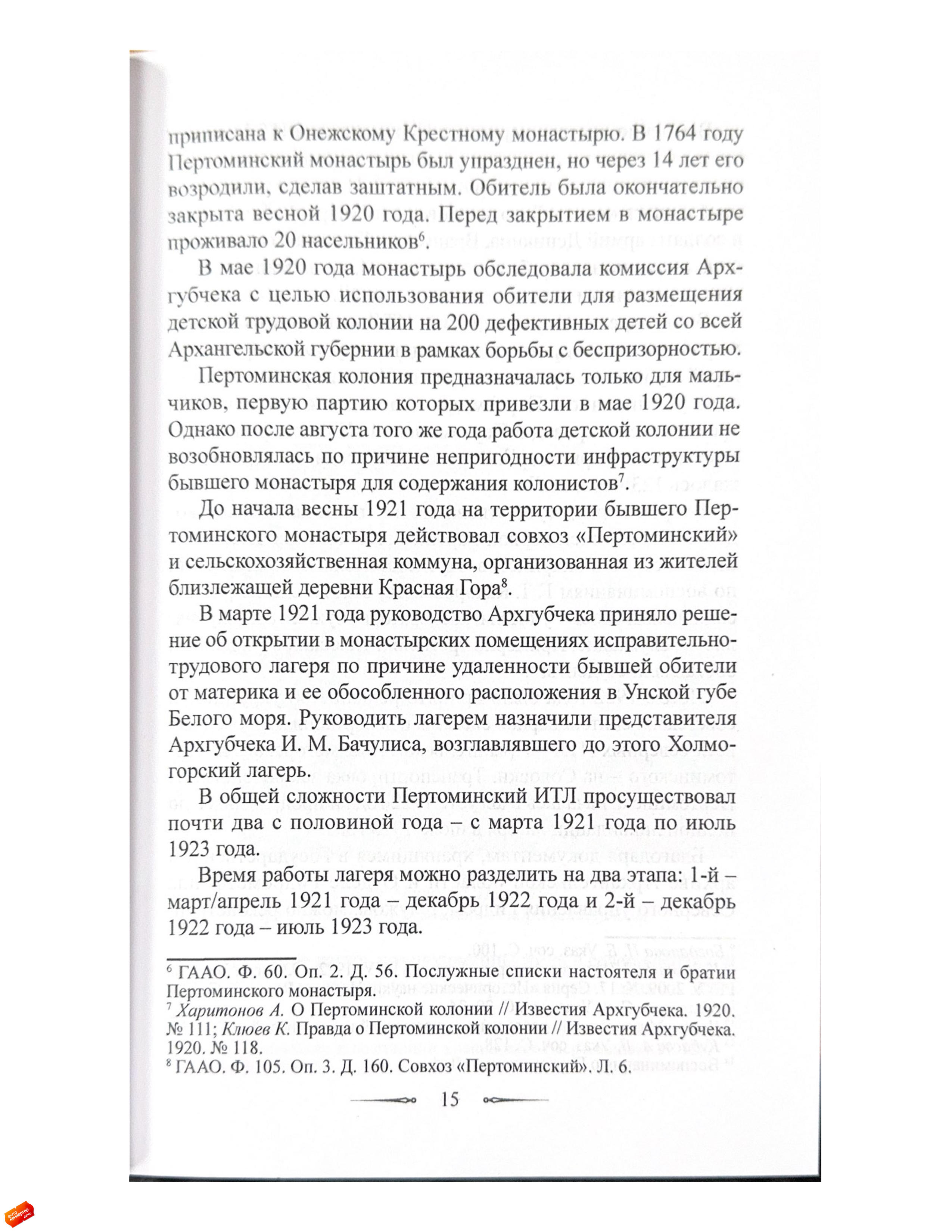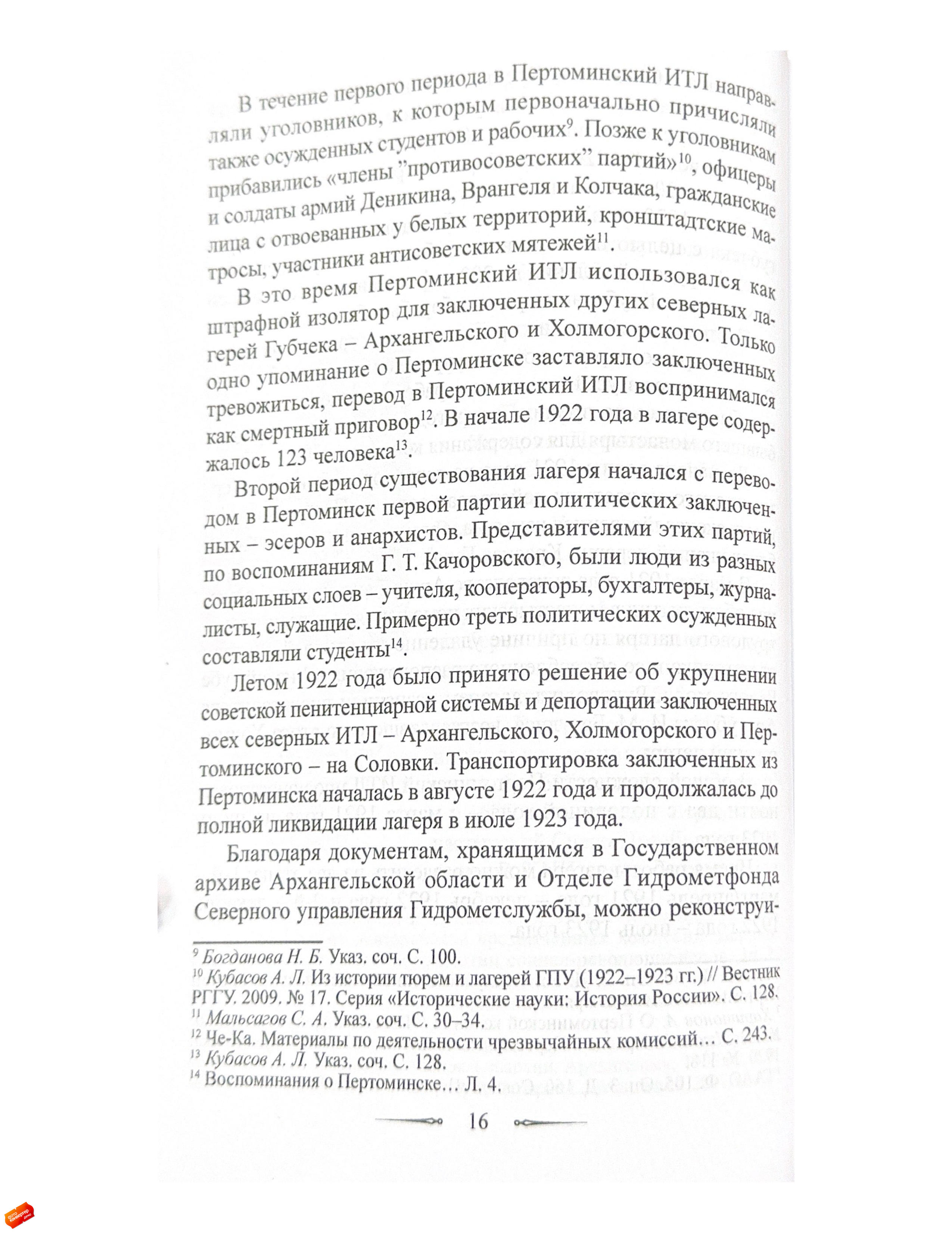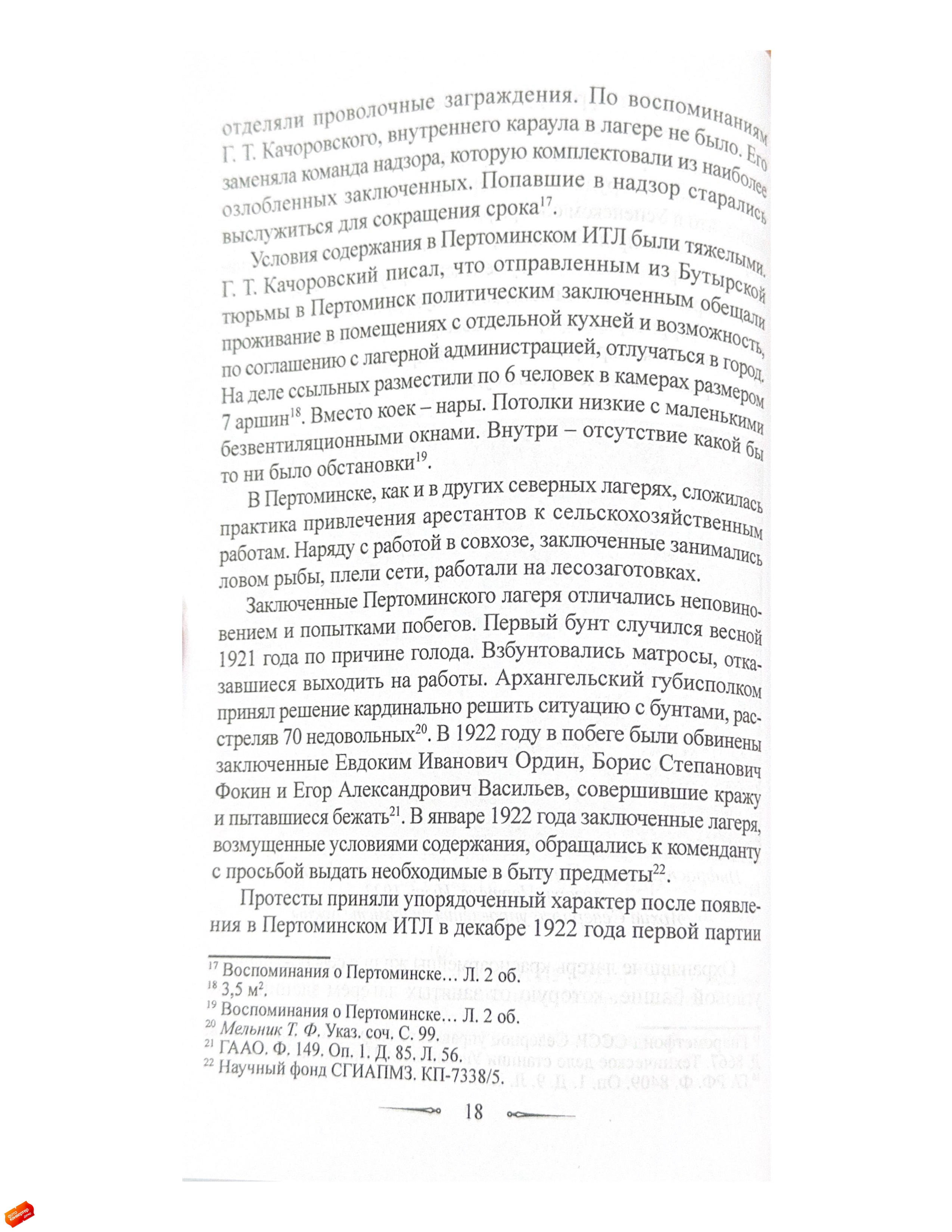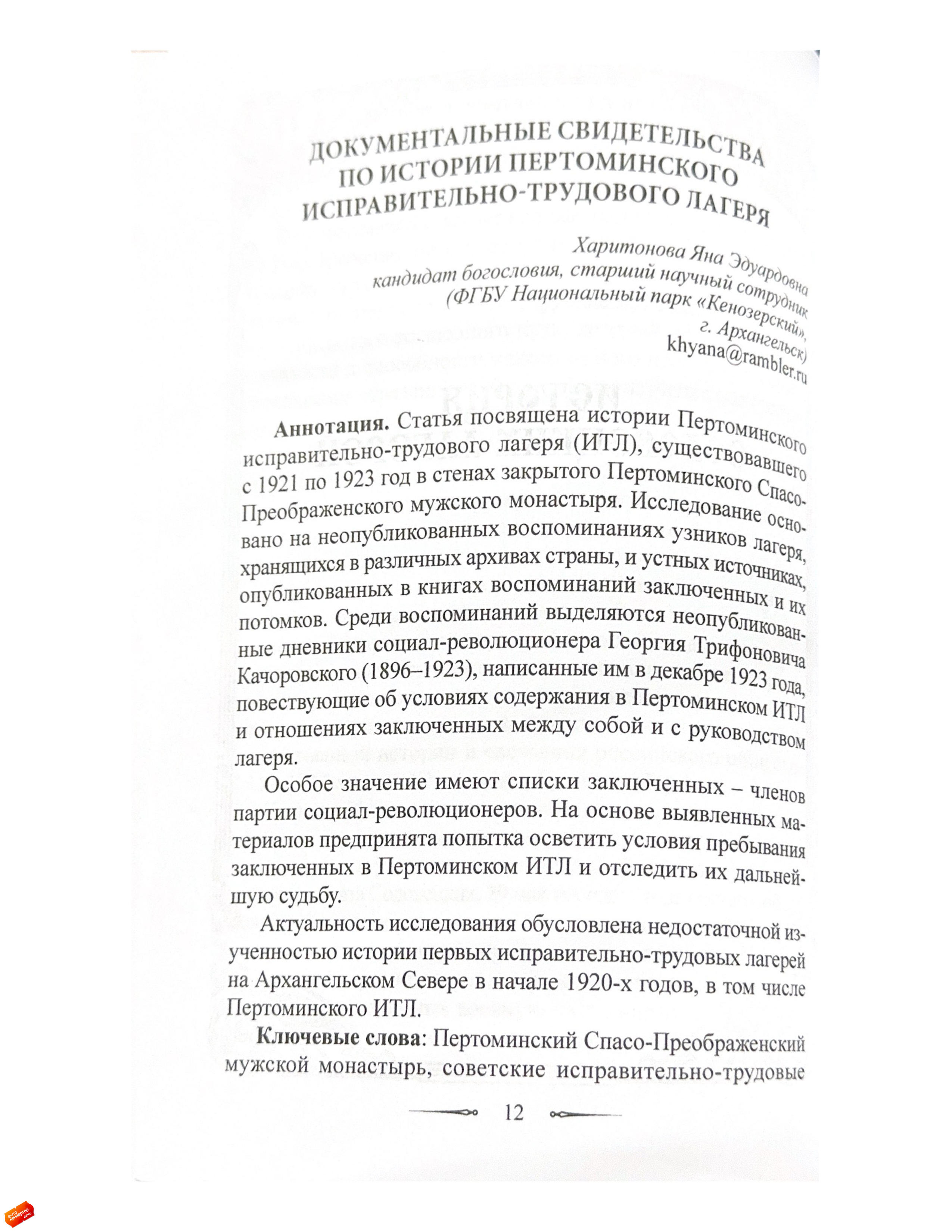 Статья посвящена истории Пертоминского исправительно-трудового лагеря (ИТЛ), существовавшего с 1921 по 1923 год в стенах закрытого Пертоминского Спасо-Преображенского мужского монастыря.Исследование основано на неопубликованных воспоминаниях социал-революционера Георгия Трифоновича Качоровского (1896–1923), написанных им в декабре 1923 года и освещающих условия содержания в Пертоминском ИТЛ, а также отношения заключенных между собой и с руководством лагеря.