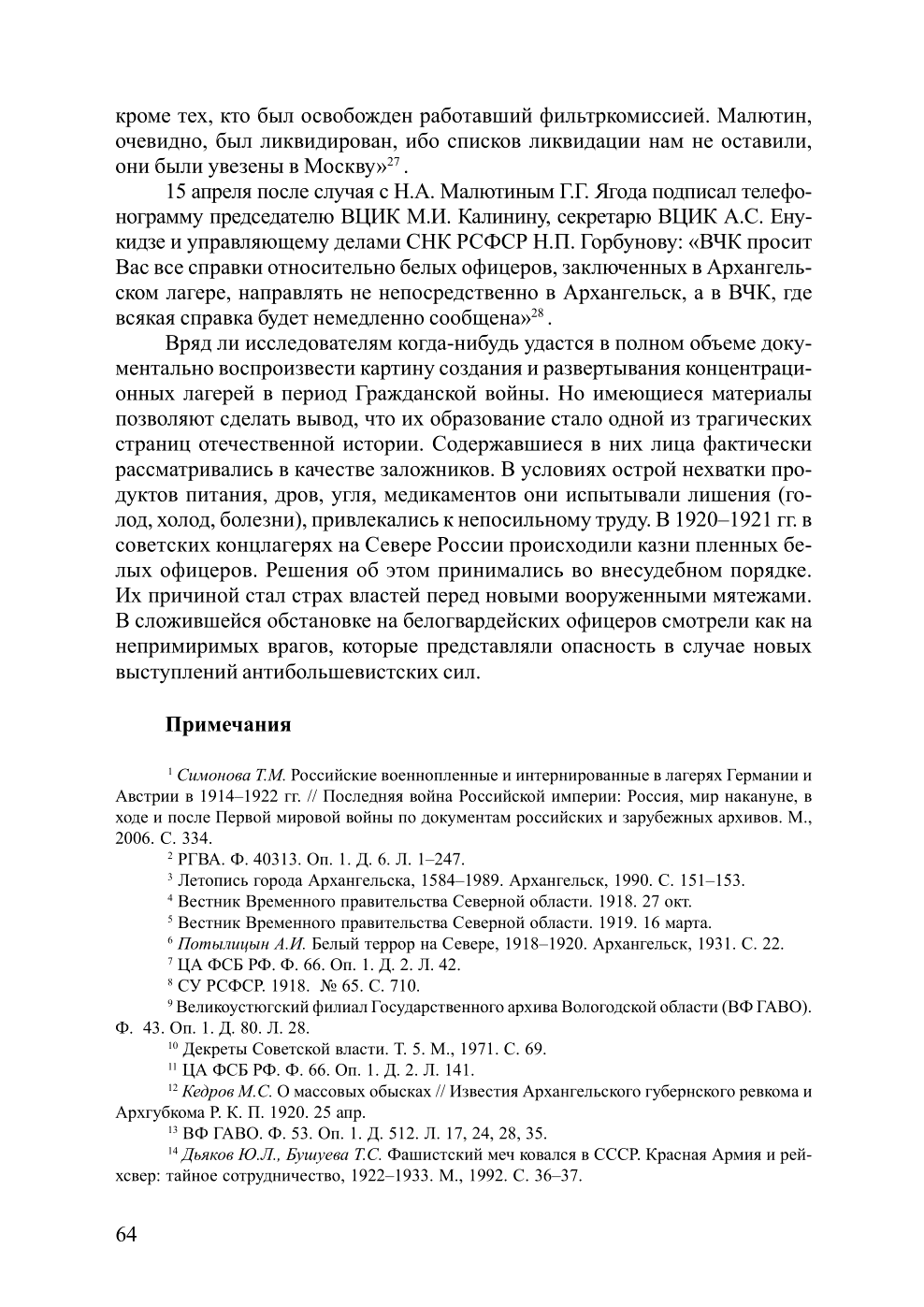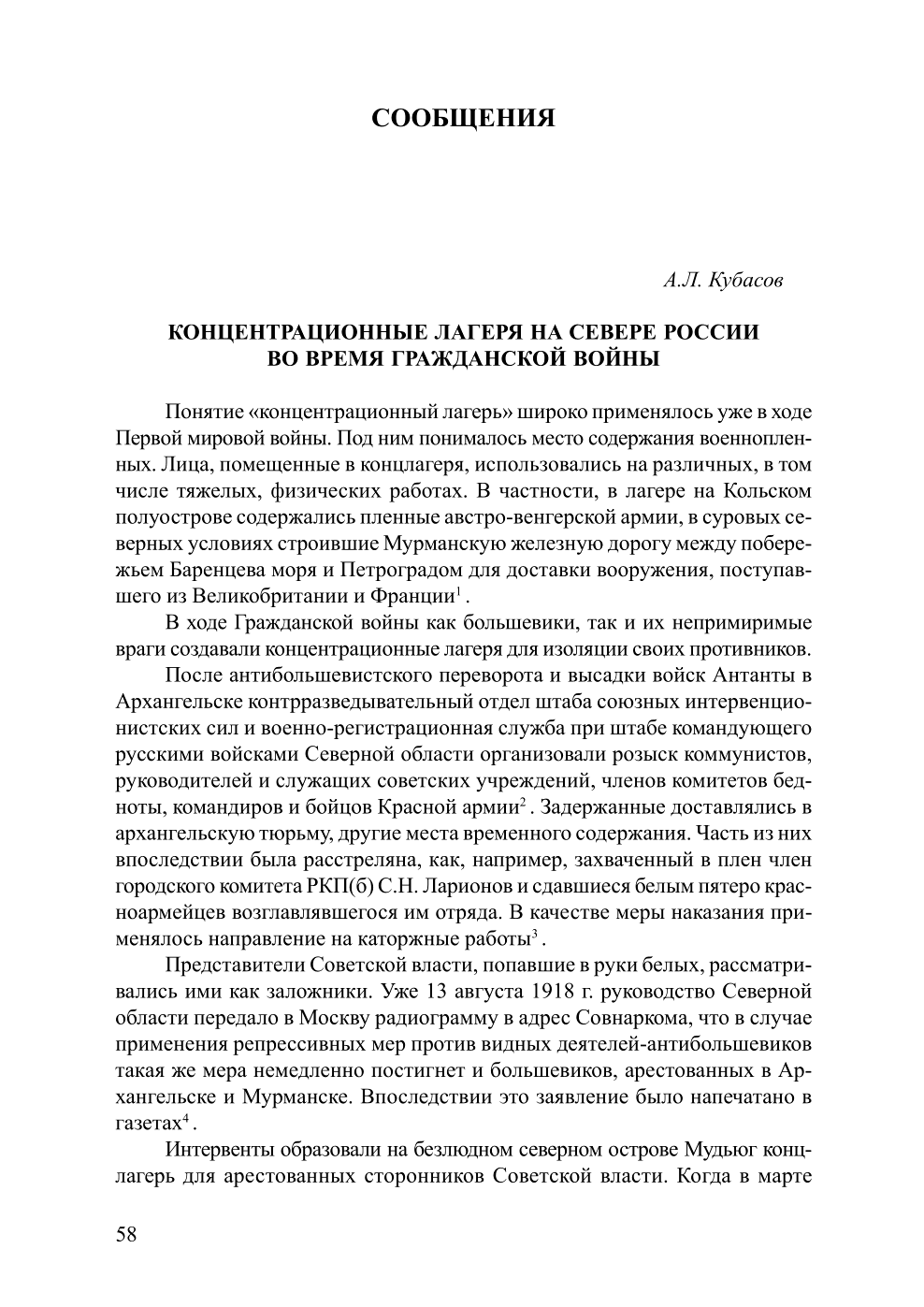 Статья А.Л. Кубасова (опубликована в журнале "Новый исторический вестник", № 2(20), 2009) посвящена истории создания первых лагерей для заложников и политзаключенных на Севере России, существовавших в период Гражданской Войны и интервенции.